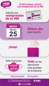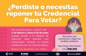 Las elecciones están a dos semanas de realizarse y en dado caso que no se cuente con la credencial de elector por robo o extravío, el martes 25 de mayo es el último día para ir los módulos del Instituto Nacional Electoral (INE) para una reimpresión.