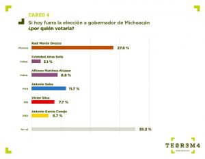 La medición arrojó que Morón Orozco cuenta con el 36.77 por ciento de la preferencia electoral rumbo a la gubernatura del estado, por lo que es el perfil más sólido, seguido de Cristóbal Arias, quien tiene una interacción de voto del 17.05 por ciento y de Antonio García Conejo con el 11.98.