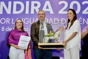Acompañado por la secretaria de Igualdad Sustantiva y Desarrollo de las Mujeres Michoacanas (Seimujer), Carolina Rangel Gracida, el mandatario entregó la presea Eréndira a Maryflor Rojas González, por su labor a favor de los derechos reproductivos y sexuales; a Elizabeth Araceli Vega Mora, por la defensa de las personas con discapacidad auditiva y a Linda Elizabeth Tinajero Ponce, por su lucha contra la violencia vicaria.