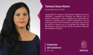 Hasta este fin de semana, Tamara Sosa Alanís, estuvo al frente de la Secretaría de Igualdad Sustantiva y Desarrollo de las Mujeres (Seimujer) del Gobierno de Michoacán, donde promovió y ejecutó distintos proyectos en defensa y protección de los derechos de las mujeres y actividades con perspectiva de género.