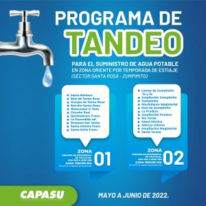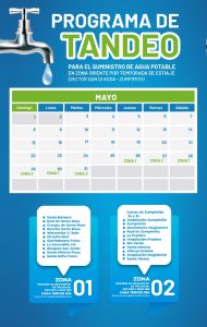 El director de este organismo operador, Rodolfo Barragán Vargas, en coordinación con el director de operación, Octavio L. Hernández Villafán, informaron que la zona oriente es la más alejada de la ciudad; por lo cual tiene mayor afectación en el abastecimiento de este vital líquido. Por lo que solicitaron la comprensión de la ciudadanía con el siguiente programa de tandeo a partir del 26 de mayo; dividiéndolo en zona 1 y 2, en un horario de 6:00 a 22:00 horas cada tercer día y, el servicio se regulará gradualmente dentro de las horas asignadas.