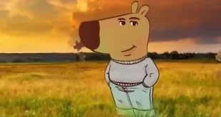 Es la ilustración de un perro de pelaje marrón claro con cuerpo humano, vestido con un suéter gris, pantalones azules y tenis rojos. El personaje posa con estilo, sonriendo a la cámara mientras mantiene las manos en los bolsillos, reflejando una actitud relajada y confiada. La ilustración fue compartida a …