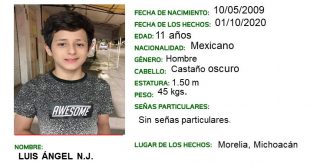 Se solicita la ayuda de la sociedad para localizar al niño Luis Ángel, quien fue visto por última vez este primero de octubre en la colonia Eucaliptos, en Morelia, y del que no se ha tenido reporte desde las 14:20 horas, por lo que se teme pueda haber sido víctima de algún …